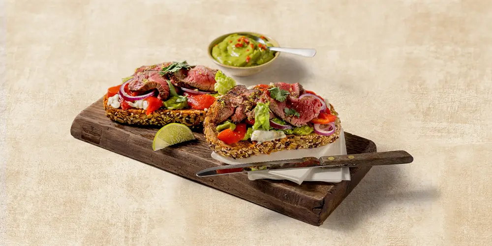 Deze Argentijnse steak sandwich brengt alles samen: malse kogelbiefstuk, knapperig zuurdesembrood, frisse chimichurri-mayo en romige guacamole. Gegrilde paprika, rode ui, limoenrasp en koriander zorgen voor extra smaak en bite. Een rijk belegde sandwich voor een stevige lunch of een makkelijke avondmaaltijd.