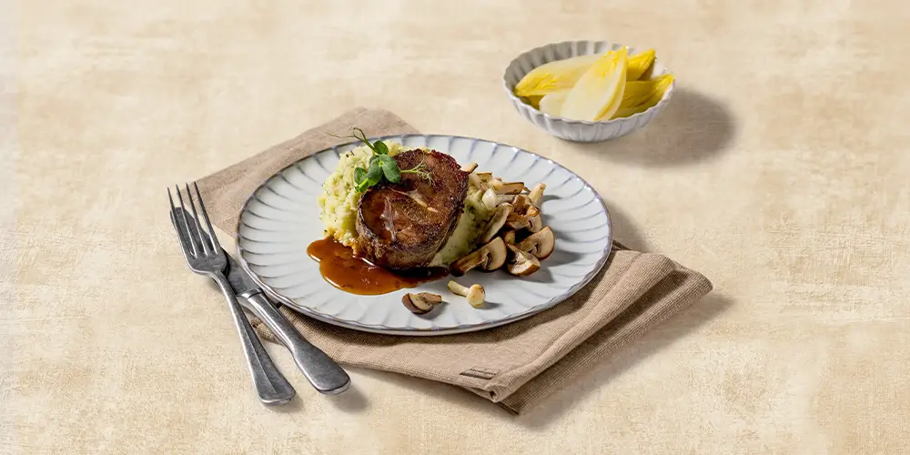 Serveer met een kruidige aardappel mousseline, witlof, gebakken paddenstoelen, gekonfijte sjalotten en de Balsamico-tijmjus.