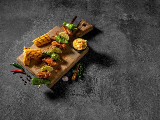 Serveer met gegrilde maiskolf en ananas chutney. ...