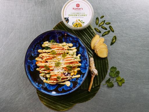 Serveer de soep met de zoete aardappel en doperwten, Garam Masala room en Sisho Purper. ...