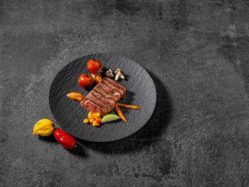 Serveer de tataki van rundvlees met zoete aardappel creme, geroosterde cherry tomaten, mango blokjes ...