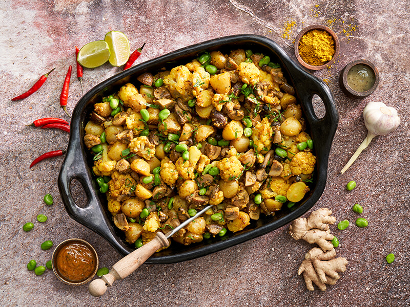 Verwen je smaakpapillen met deze combinatie van bloemkool, champignons en tuinbonen, op smaak gebrac ...