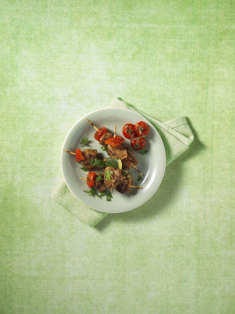 4. Rijg de lamsbout, courgette en paprika om en om op de spiesen tot deze vol zijn.